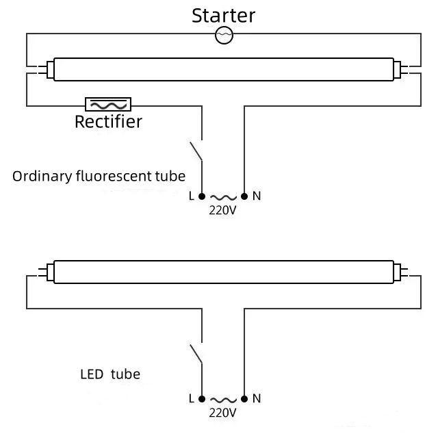 Как установить светодиодную трубку? Схема подключения обычной люминесцентной лампы и светодиодной трубки. Недавно установленные светодиодные трубки и сменные светодиодные трубки1.Подключение вновь установленных светодиодных трубок. Если вновь установленная светодиодная трубка является двусторонней, при условии, что патрон лампы на обоих концах светодиодной трубки подключен напрямую.